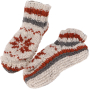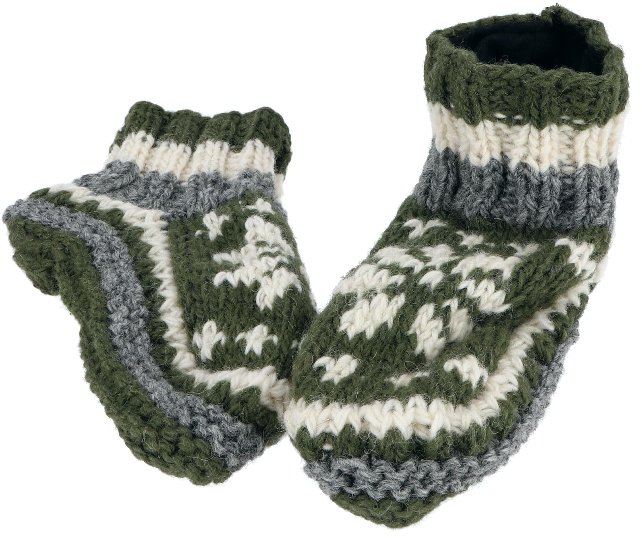 Kuschelig warme, handgestrickte Hüttenschuhe. Unsere schönen Füßlinge werden in Nepal unter fairen Bedingungen in Heimarbeit gefertigt. Frauen wird es auf diese Weise ermöglicht zum Gelderwerb der Familie beizutragen, was unter den örtlichen Gegebenheiten sonst oft schwierig ist. Jedes Paar ist ein Unikat und kann in Farbigkeit und Muster leicht von der Abbildung abweichen. Größe: 41 - 43